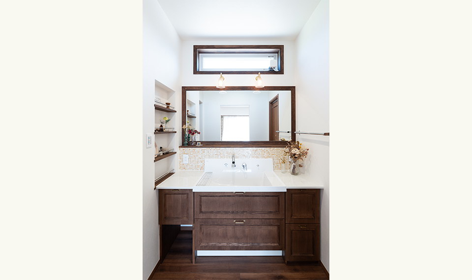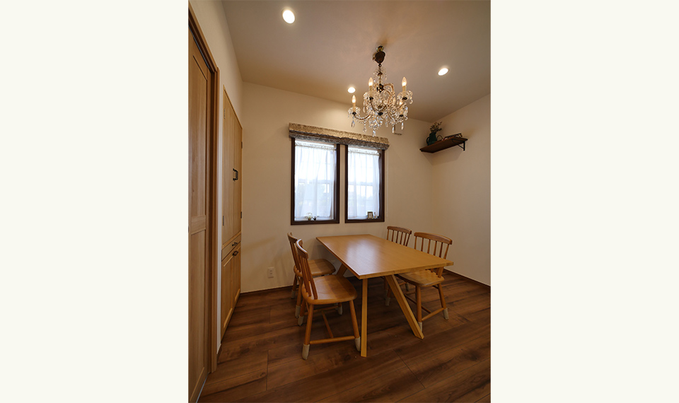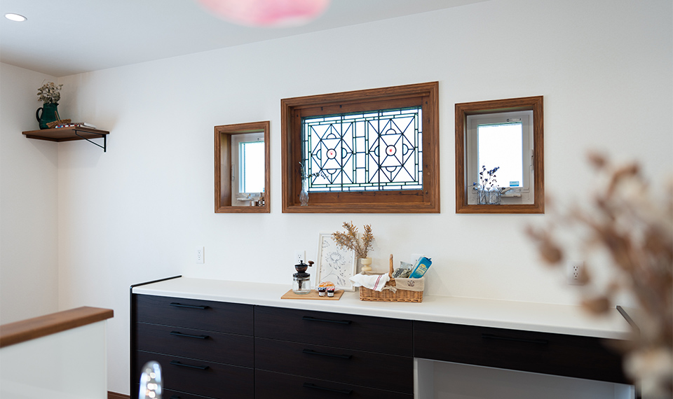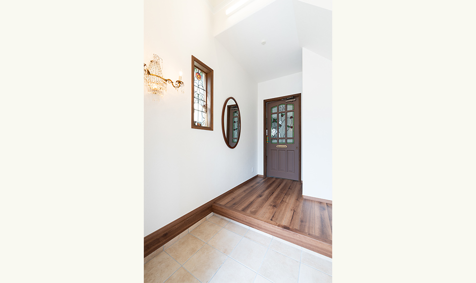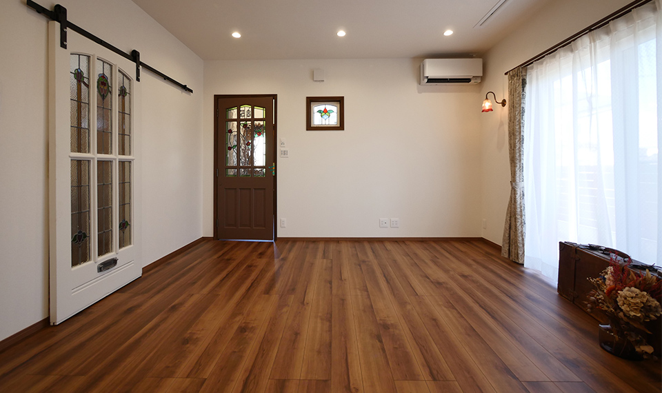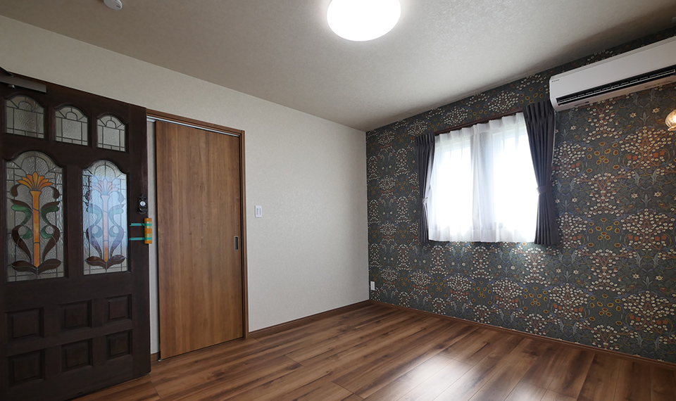 アンティークが大好きな奥様。こつこつとこれまで集めてきたアンティークの建具やステンドグラス、照明器具などを全部詰め込んだマイホームづくりがスタートしました。このドアをどこに使おう?この照明は寝室に合うかな?など、沢山考えながらプランを練りました。完成したおうちはアンティークの持つ穏やかな時間の経過をゆったりと感じられるような素敵な空間。落ち着いた色合いの木の温もりも、アンティークにうまく溶け込み、新築でありながら、もう何年も住んできたかのような愛着あるおうちに仕上がりました。大好きなウィリアムモリスのクロスも至る所に配し、大人可愛い空間となりました。